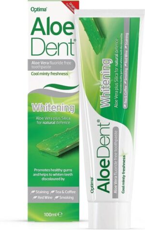 Aloe Dent Aloe Vera Toothpaste, Whitening – 100ml Aloe Dent Whitening Toothpaste harnesses some of nature’s most powerful and effective cleaning ingredients so you can whiten your teeth gently and without harsh abrasives. Aloe Vera and silica clean, whiten and sooth whilst essential oils of tea tree oil, peppermint and menthol freshen breath and protect gum health. With no fluoride and no harsh chemical cleaning agents, this toothpaste is ideal for sensitive teeth which need a triple-action whitening touch. Note: Item has PAO symbol, expires after 12 months from opening.